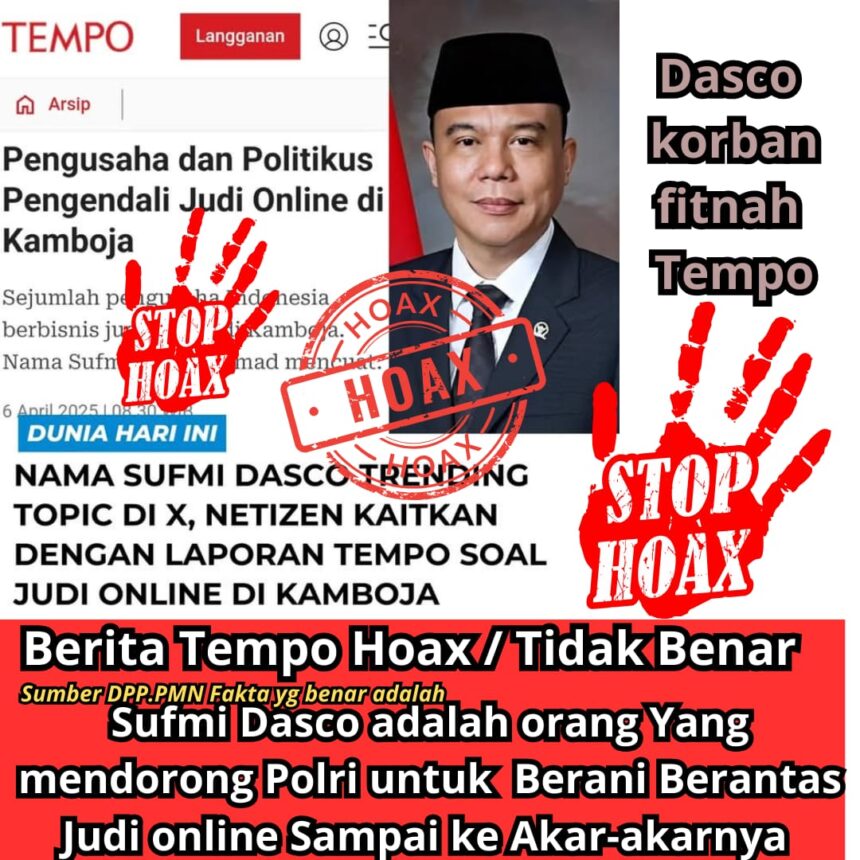 Terkait isu yang digiring oleh tempo untuk menjelekan pak Sufmi Dasco ini adalah fitnah yang keji , kami meyakin 100% berita tempo salah & akan melaporkan tempo ke dewan pers / penegak hukum bila di perlukan.